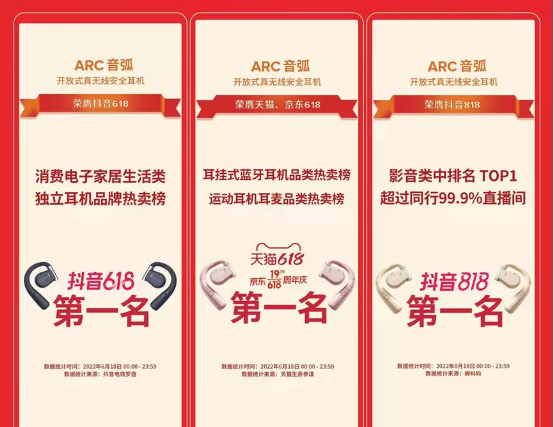 在眾多開(kāi)放式耳機(jī)品牌中,以國(guó)際智能聲學(xué)品牌Cleer最為突出。其在2021年12月推出的Cleer ARC系列一代產(chǎn)品是國(guó)內(nèi)首批推出的開(kāi)放式真無(wú)線耳機(jī),一經(jīng)上市便以“不入耳、不傷耳 安全更舒適”的差異化賣點(diǎn)迅速席卷市場(chǎng),在市場(chǎng)上掀起了一股開(kāi)放式真無(wú)線耳機(jī)的聽(tīng)音新“響”法熱潮。值得一提的是,它還打破了當(dāng)時(shí)無(wú)線智能耳機(jī)市場(chǎng)跟風(fēng)AirPods的局面,一舉成為2022年度“爆款”電子產(chǎn)品,在抖音618、818、雙11等重磅電商活動(dòng)中均穩(wěn)居各大榜單銷售榜首,更為耳機(jī)行業(yè)開(kāi)辟了一條新的開(kāi)放式耳機(jī)賽道。