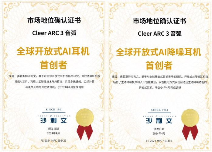 由于其在AI技術(shù)和降噪技術(shù)方面的創(chuàng)新突破,Cleer ARC 3音弧 降噪版榮獲了沙利文頒發(fā)的《全球開(kāi)放式AI耳機(jī)首創(chuàng)者》和《全球開(kāi)放式AI降噪耳機(jī)首創(chuàng)者》兩項(xiàng)認(rèn)證證書(shū),這不僅是對(duì)其技術(shù)創(chuàng)新的認(rèn)可,也是對(duì)其在提升用戶體驗(yàn)和安全性方面所做貢獻(xiàn)的肯定。