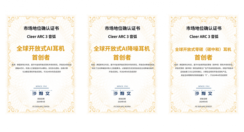 Cleer ARC 3 音弧的技術(shù)創(chuàng)新與環(huán)保理念也通過(guò)了國(guó)際權(quán)威機(jī)構(gòu)沙利文的認(rèn)證,獲得了“全球開(kāi)放式AI降噪耳機(jī)首創(chuàng)者”、“全球開(kāi)放式零碳(碳中和)耳機(jī)首創(chuàng)者”、“全球開(kāi)放式AI耳機(jī)首創(chuàng)者”等多項(xiàng)榮譽(yù)證書(shū)。這些認(rèn)證不僅是對(duì)Cleer產(chǎn)品創(chuàng)新的高度肯定,也進(jìn)一步奠定了Cleer在國(guó)際聲學(xué)領(lǐng)域的領(lǐng)先地位。